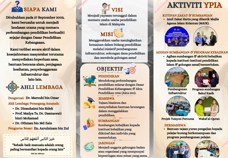 Yayasan Pendidikan Islam Aman (YPIA) diperbadankan pada 27 September 2003 sebagai sebuah syarikat berhad menurut jaminan di bawah Akta Syarikat 1965. Kami merupakan amil zakat bertauliah Majlis Agama Islam Kelantan (MAIK) dan terlibat secara aktif dalam kesejahteraan masyarakat. Kami berusaha untuk menjadi landasan utama yang memacu perkembangan pendidikan berkualiti sejajar dengan Dasar Pendidikan Kebangsaan.